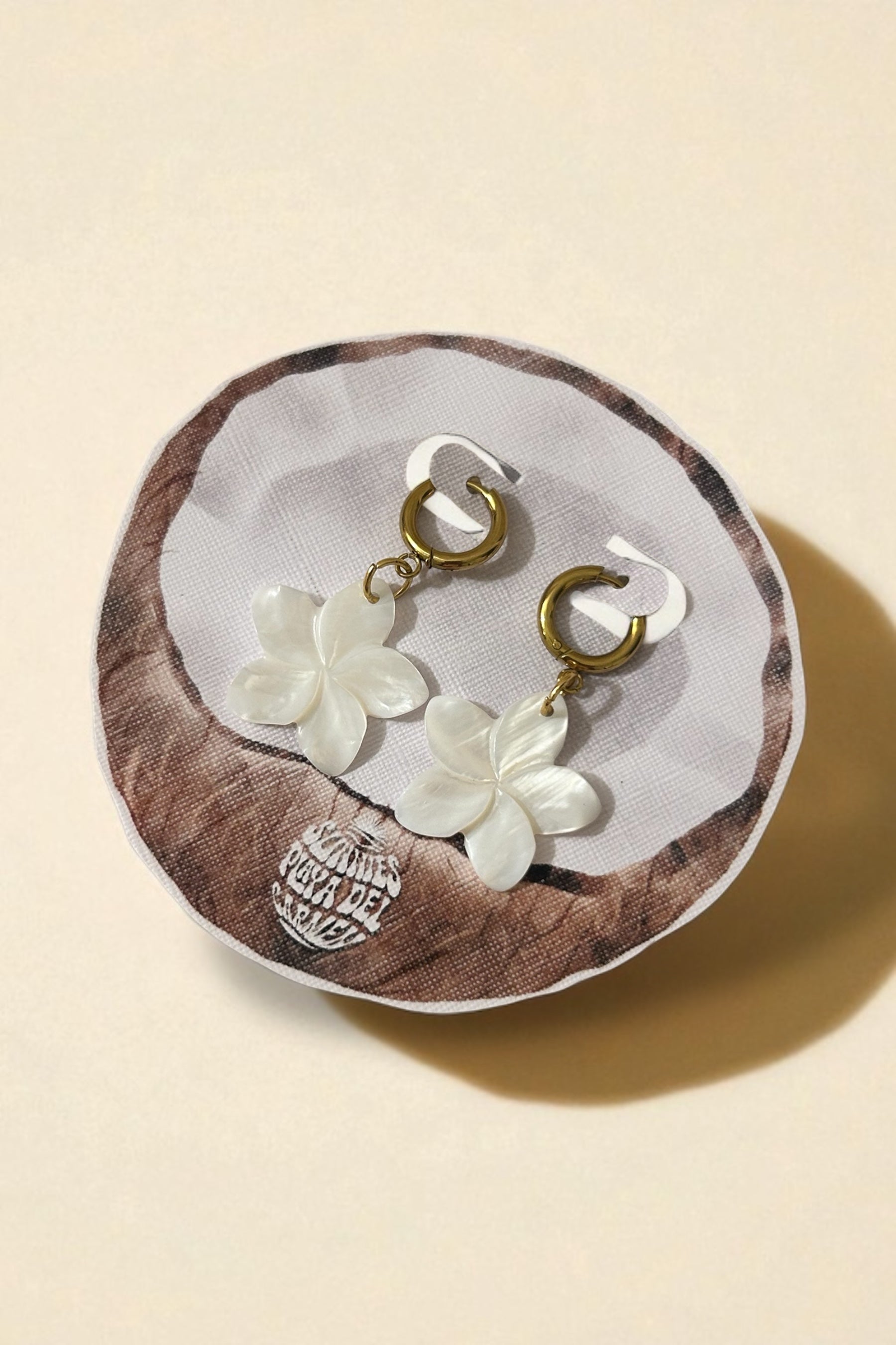 Luce el Caribe con estos hermosos aretes de flor tallada en concha madre natural. Cuelgan de aros tipo hoop de acero inoxidable dorado, resistentes al agua y al desgaste, ideales para acompañarte del mar a la ciudad.